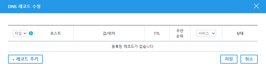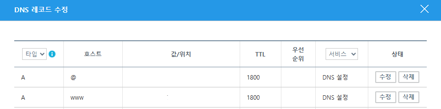 - [레코드 수정]을 클릭하여 DNS 설정을 변경해줍니다.
