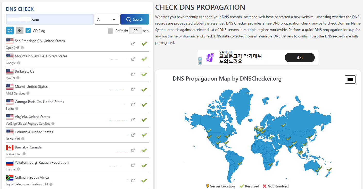 - 각 나라명 옆에 새로운 벌처 서버 ip주소가 뜨고 초록색 체크 표시가 뜨면 내 도메인 서버 주소 변경이 잘 된 것입니다.