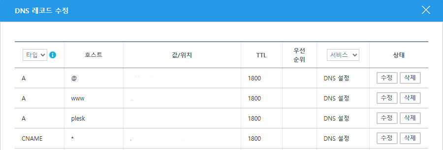 - [레코드 수정]을 클릭하여 DNS 설정을 변경해줍니다.