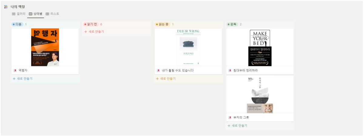 - 책을 추가 하고 싶다면 책장, 읽고 있는 책, 다음 읽을 책 어디든 +새로 만들기를 클릭합니다.