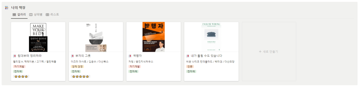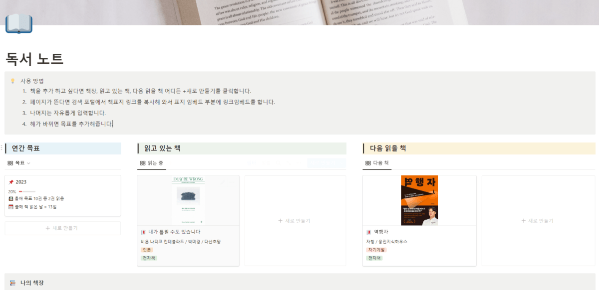 - 책을 추가 하고 싶다면 책장, 읽고 있는 책, 다음 읽을 책 어디든 +새로 만들기를 클릭합니다.