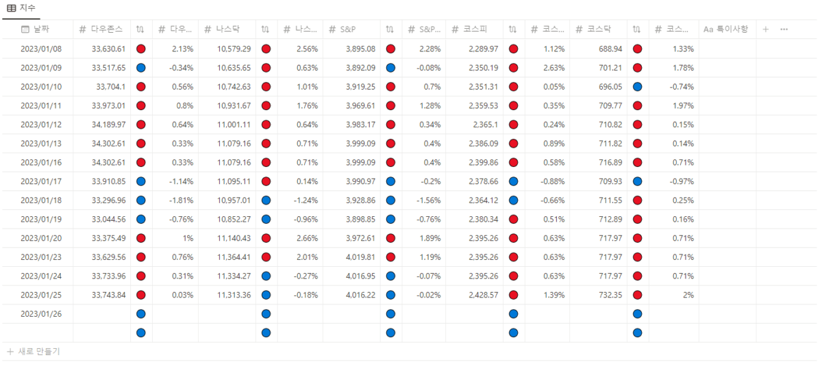 - 노션은 엑셀과 달리 (+),(-)에 대해 글자색이 바뀌도록 서식을 설정할 수 없어서 직접 변경해줘야하지만, 수식을 이용하여 등락을 보여주는 동그라미를 만들었습니다.