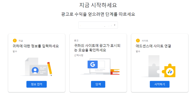 - 애드센스 홈페이지의 '애드센스에 사이트 연결' 카드에서 [시작하기]를 클릭합니다.