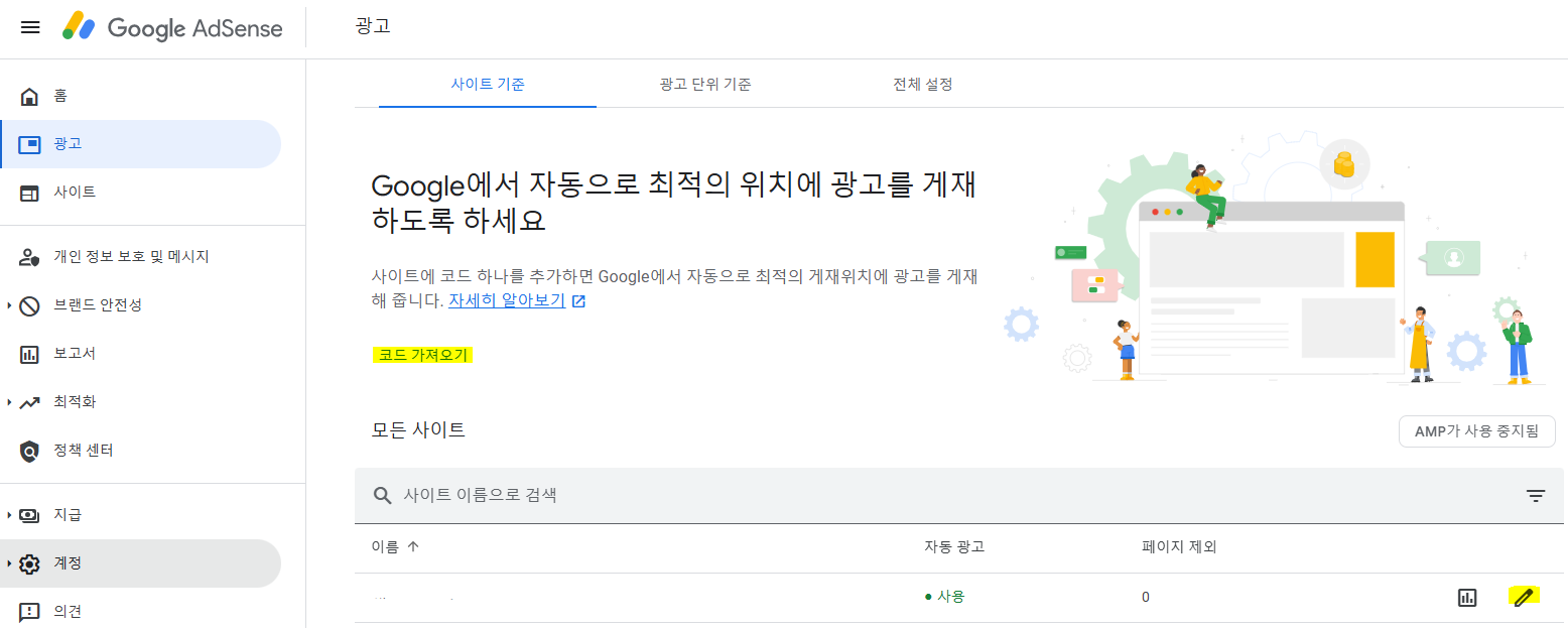 - 사이트 주소 오른쪽 끝 연필모양을 클릭하면 미리 자동광고 설정 및 시뮬레이션을 해볼 수 있습니다.