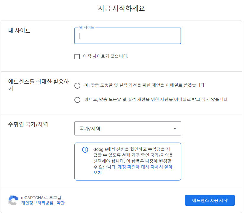 나중에 사이트를 추가하려면 이 입력란을 비워두고 아직 사이트가 없습니다를 선택합니다. - 애드센스에서 맞춤 도움말과 실적 개선을 위한 권장사항을 받을지를 선택합니다.