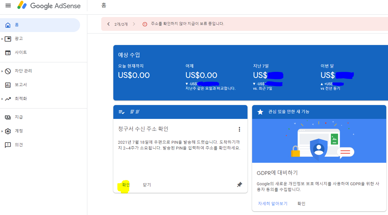 - 애드센스 정책 상 4개월이 지났는데 애드센스 PIN번호를 입력하지 않으면 페이지에서 광고 게재가 중단됩니다.