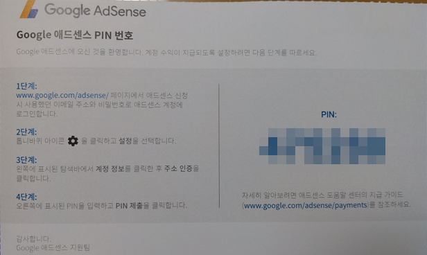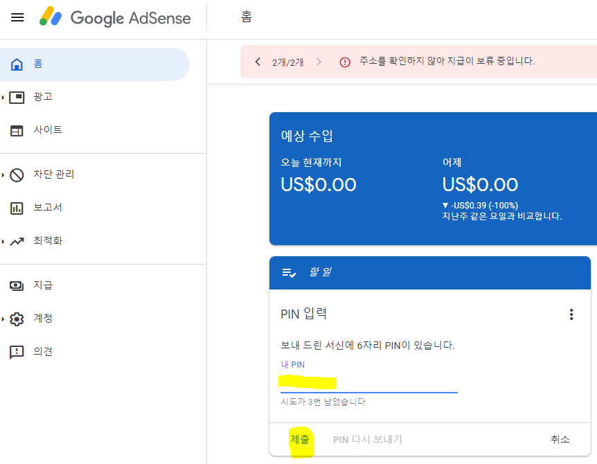 애드센스 PIN 입력