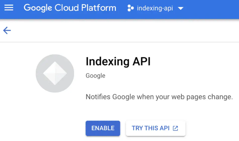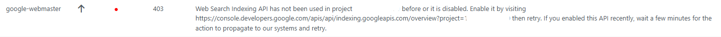 Indexing API has not been used in project PROJECT_ID before or it is disabled. Enable it by visiting https://console.developers.google.com/apis/api/indexing.googleapis.com/overview?project=PROJECT_ID then retry. If you enabled this API recently, wait a few minutes for the action to propagate to our systems and retry.