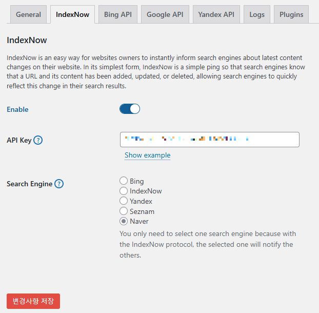 - 설치 후 활성화를 완료하면 IndexNow 메뉴가 생깁니다.