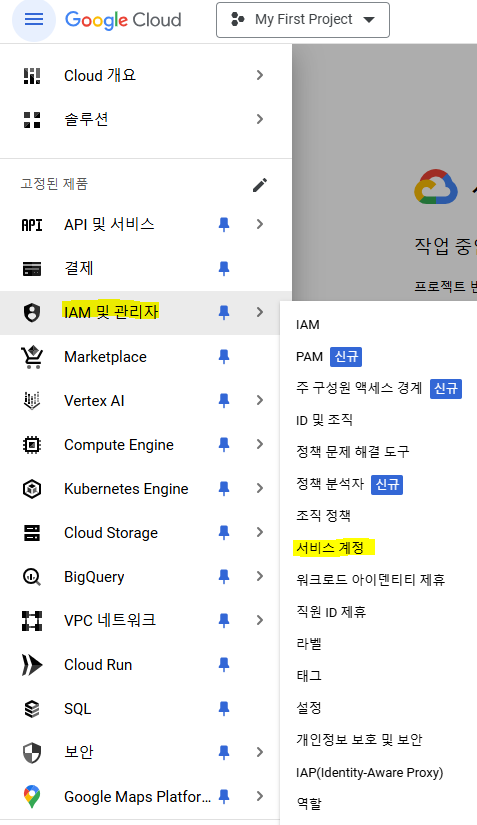 - 구글 개발자 콘솔 로그인 -> IAM 및 관리자 -> 서비스 계정 -> + 서비스 계정 만들기