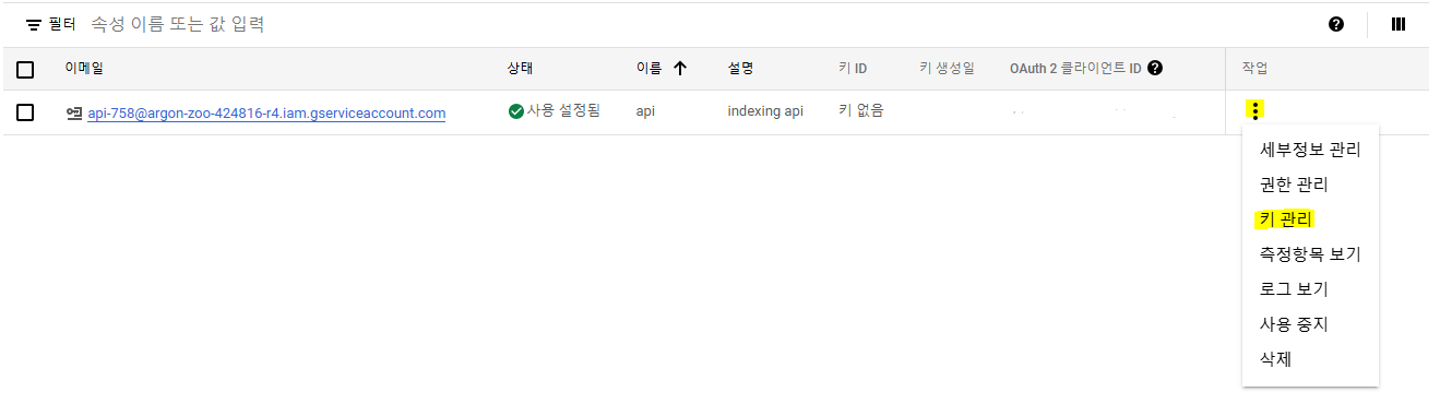 - 키 관리 -> 키 추가 -> 새 키 만들기 -> JSON -> 자동으로 다운로드된 JSON 파일 열기