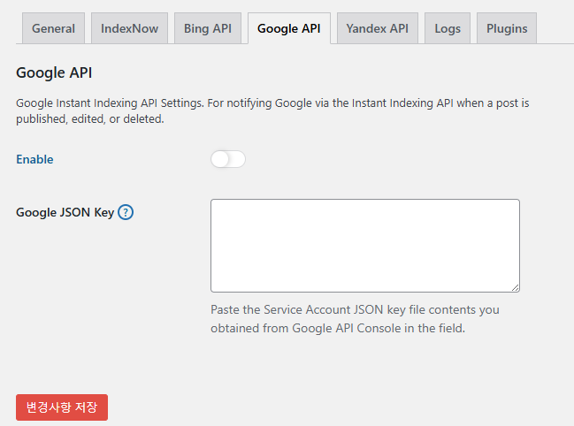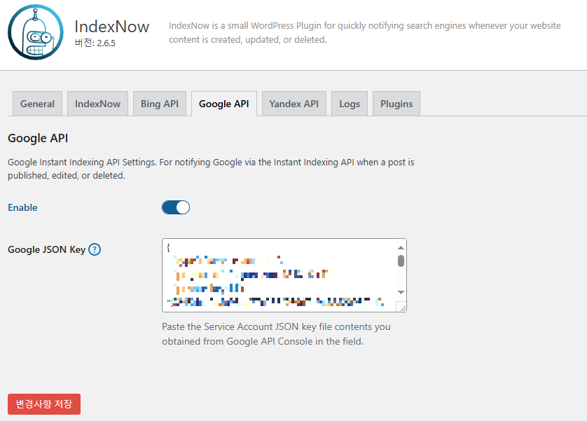 - 복사한 코드를 플러그인의 Google JSON Key에 붙여 넣기하고 변경사항 저장을 클릭합니다.