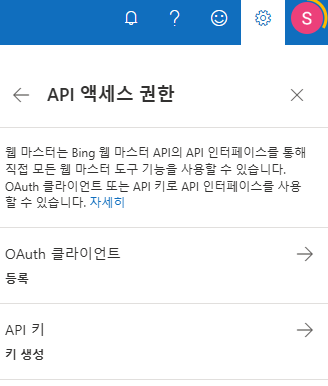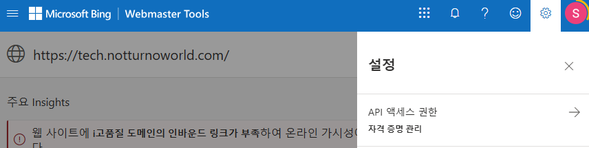 - 빙 웹마스터도구에 로그인하여 오른쪽 상단 톱니바퀴를 클릭합니다.