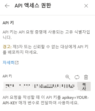 - API 액세스 권한 -> API 키 -> API키 생성 -> 복사