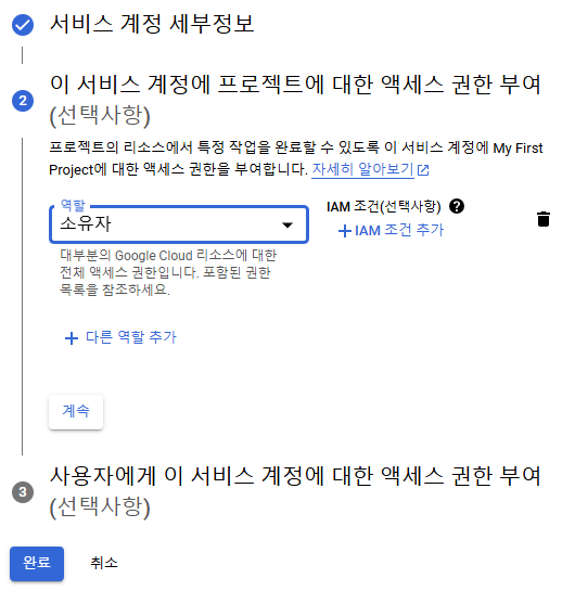 - [만들고 계속하기]를 클릭해서 역할을 소유자로 설정합니다.