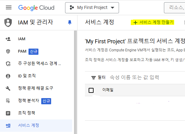 - 구글 개발자 콘솔 로그인 -> IAM 및 관리자 -> 서비스 계정 -> + 서비스 계정 만들기