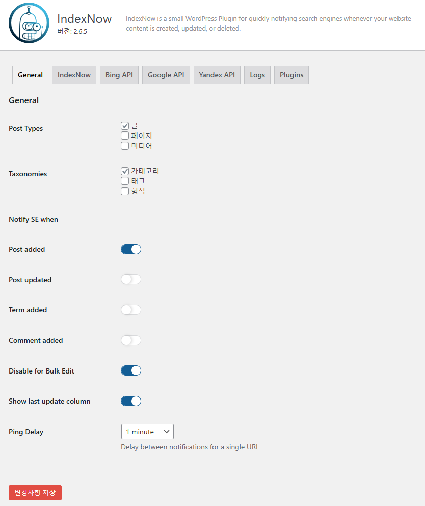 - 러시아 개발자 미하일 콥자레프의 Index Now SEO 플러그인을 사용하면 쉽고 빠르게 색인요청이 가능합니다.