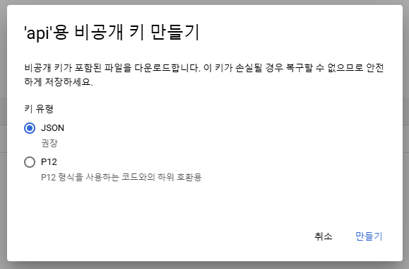 - 키 관리 -> 키 추가 -> 새 키 만들기 -> JSON -> 자동으로 다운로드된 JSON 파일 열기
