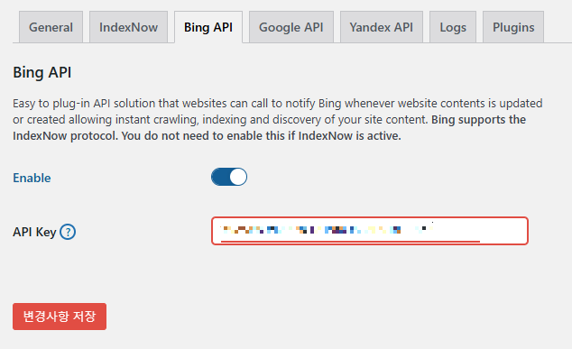 - Enable가 꺼져있다면 켜주시고 [변경사항 저장]을 하시면 빙 자동 색인 요청이 가능해집니다.