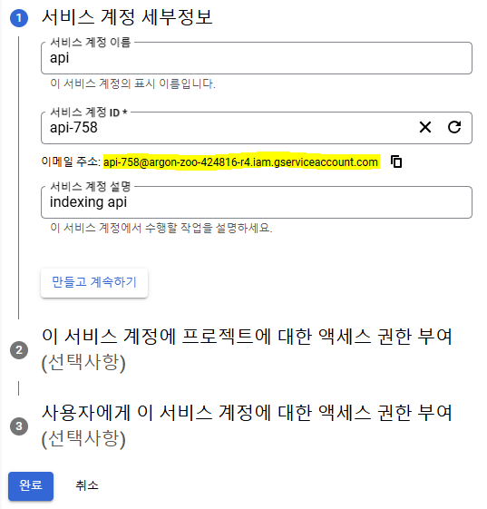 - 서비스 계정이름 및 계정 ID, 설명을 원하는 대로 작성해 줍니다.