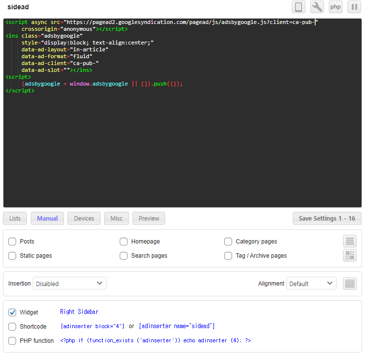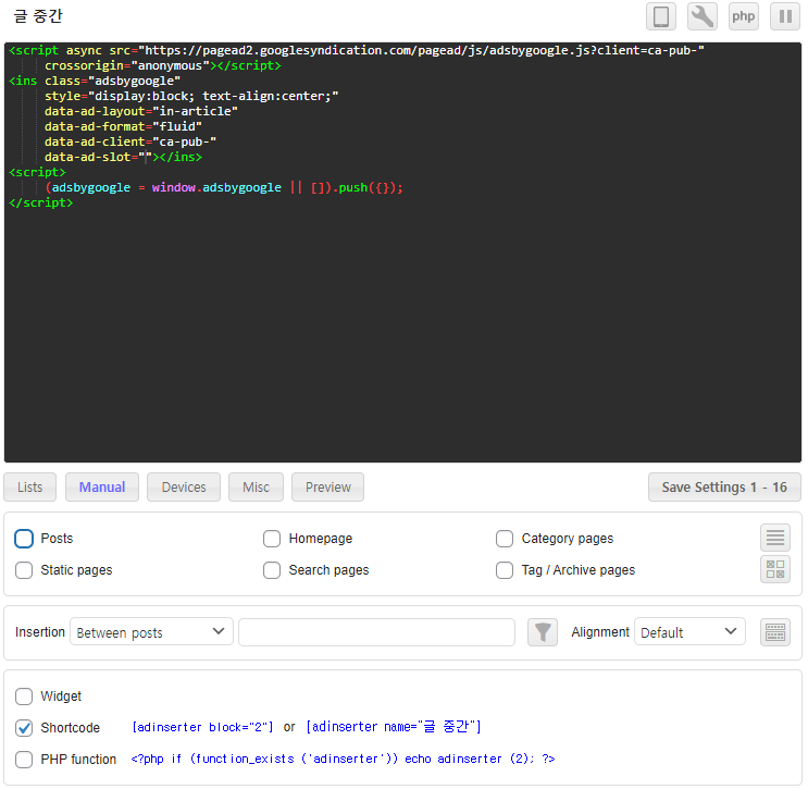 • 원하는 광고 코드를 검은 공간에 입력하고 매뉴얼에 숏코드를 체크해줍니다.