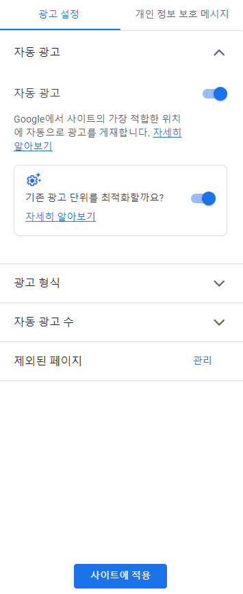 • 자동 광고를 활성화 하면 됩니다. 광고 형식과 광고 수에서 자동 광고의 형식과 수를 설정할 수 있습니다.