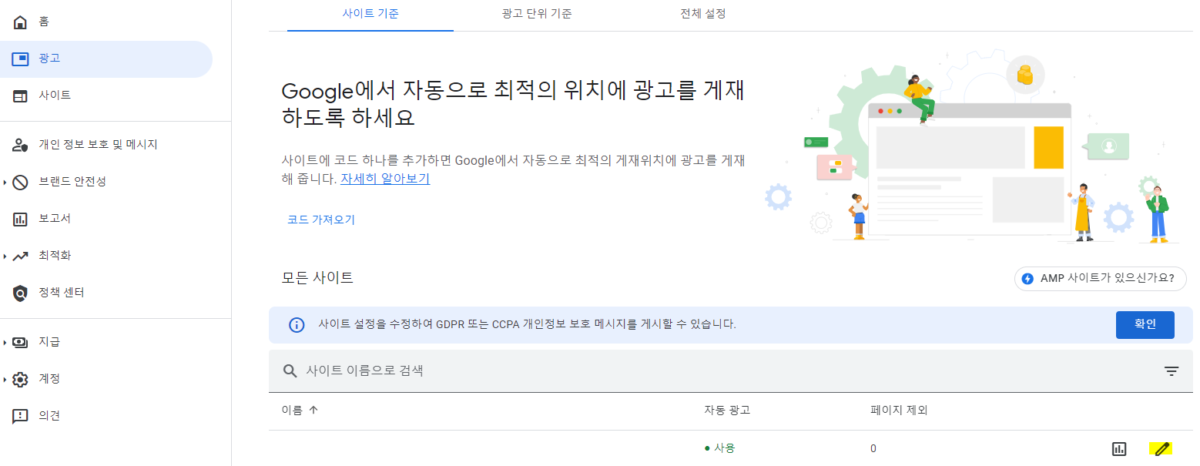 • 그리고 자동 광고 기능을 이용하고자하는 사이트 오른쪽 연필모양을 클릭