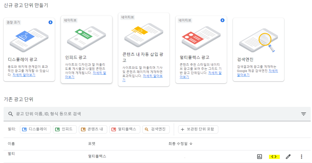 - 그럼 기존 광고 단위에 유형별로 광고 코드를 확인할 수 있습니다.