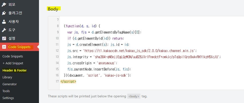 - 위 플러그인을 설치하셨다면 Header & Footer의 body 칸에 아래 그림처럼 붙여넣기 후 저장해주시면 됩니다.