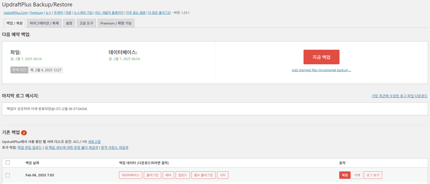 - UpdraftPlus라고 적힌 메뉴에서 [지금 백업]을 클릭해 수동 백업파일을 만들 수 있습니다.