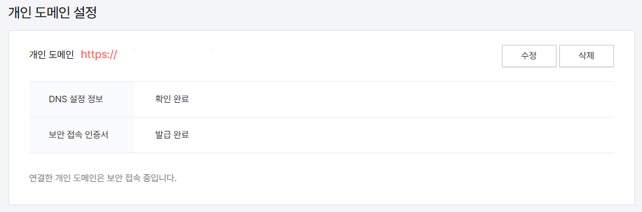 • 도메인 등록 후 DNS 설정이 제대로 되었다면 DNS 설정 정보에 '확인 완료'로 뜹니다.