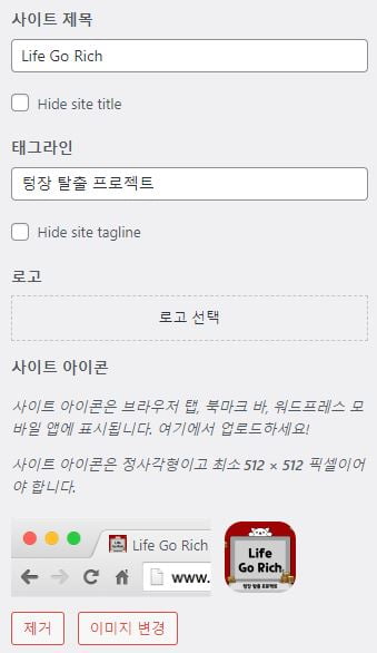 - 사이트 가장 상단의 타이틀과 사이트 설명, 로고, 사이트 아이콘(파비콘)을 설정할 수 있습니다.