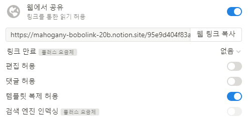 - 댓글 허용 : 링크를 공유받은 Notion 사용자가 페이지에 댓글을 남길 수 있습니다.