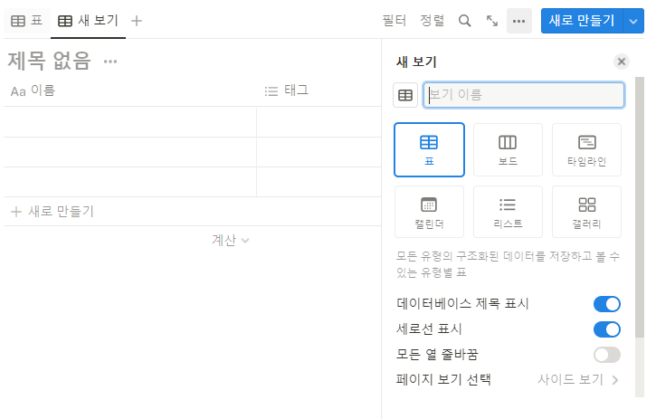 - 보기 : 데이터베이스의 다양한 보기를 편집하고 토글로 보기를 선택합니다.