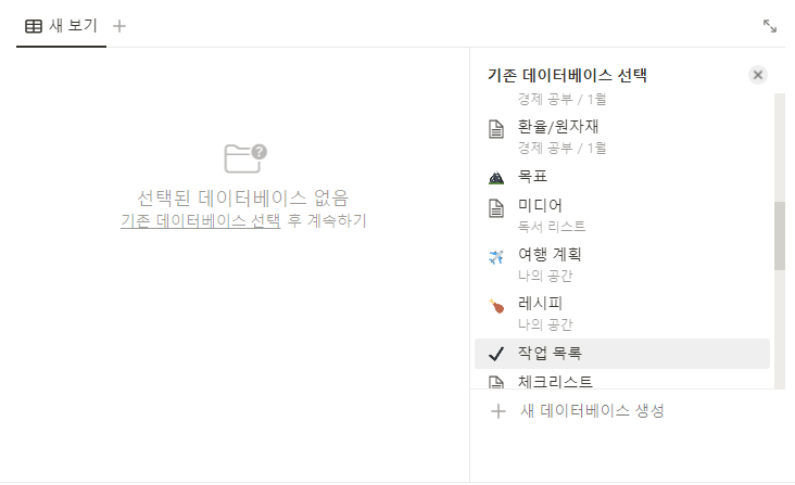 - 기존 데이터베이스를 선택하면 여러 곳에 흩어진 정보를 한데 모으거나, 다른 데이터베이스에 있는 속성을 재활용하거나, 워크스페이스의 다른 페이지에 있는 보기를 가져올 때 편리합니다. 기존 데이터베이스를 검색하여 선택할 수 있습니다.