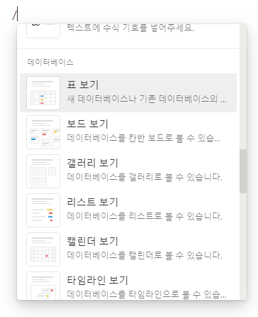 - 워크스페이스에서 페이지를 만든 후 빈 페이지의 / 뒤에 원하는 데이터베이스 레이아웃(표, 보드 등)을 클릭하여 생성할 수 있습니다.